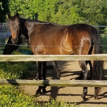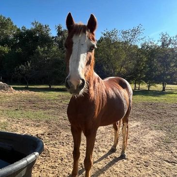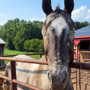 Our "poop pony" arrived at the farm with his best friend Eclipse. He was pulled from the kill pen covered in caked on manure (he must have been living and sleeping in it). Under his matted coat was oozing sores. He is 100% and happily spending his days with his best girl.